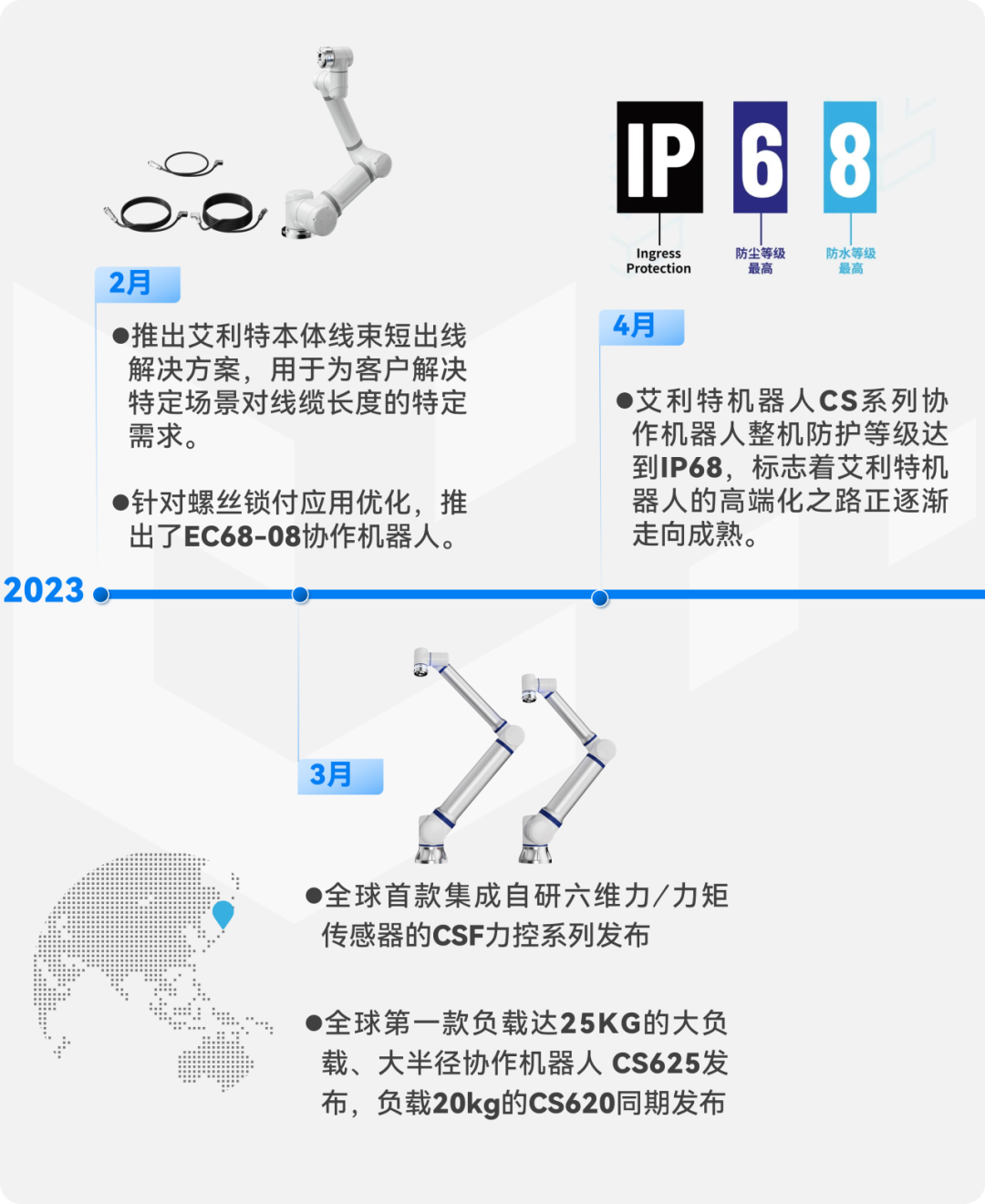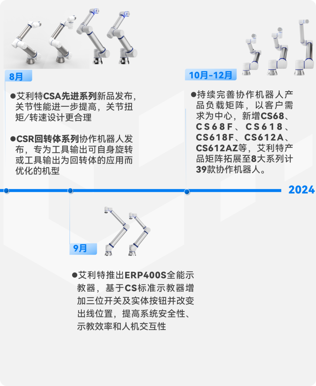 2023年,AG庄闲机器人在技术上全力进阶前行,针对应用持续拓展产品矩阵,推出6大全新系列协作机器人,让AG庄闲产品矩阵拓展至8大系列:稳定可靠的EC系列,性能卓越的CS系列,自研六维力传感器的CSF系列,高精高速的CSA先进系列,码垛专家CSH地平线系列,不惧高危环境的CS防爆系列,以及为打磨、螺丝锁付、焊接、切割等而生的CSR回转体系列,售价亲民的EA系列。