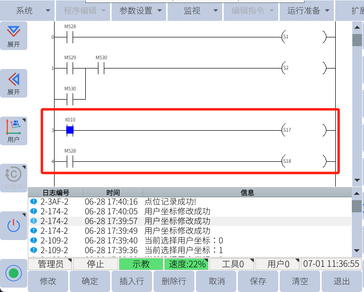 用户通过在 扩展>用户PLC 界面配置辅助寄存器S17、S18触发条件。