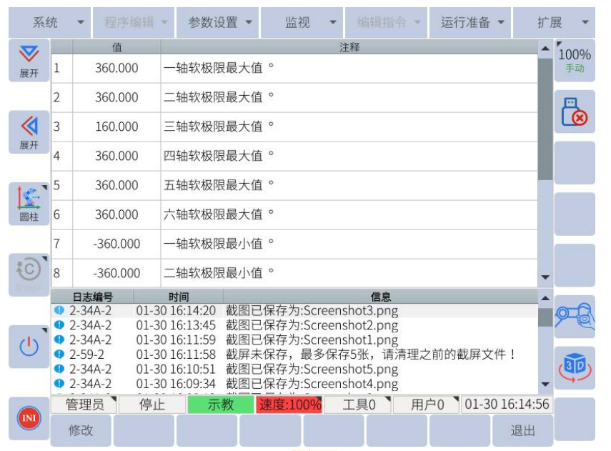 软极限可以限制每个关节的旋转极限。导航 参数设置 -> 软极限设置 除了3轴极限为正负160°其他轴极限均为正负360°。