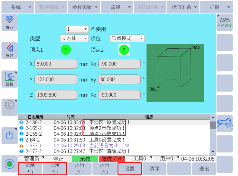 4. 选择“顶点 2”,用轴操作键移动机器人到立方体的顶点 2,点击“记录点 2”。