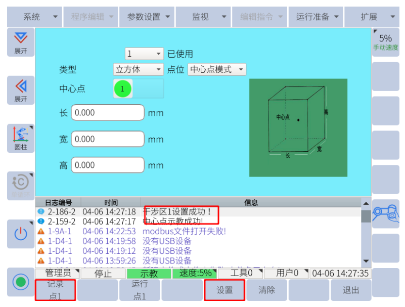 3. 选择“中心点”,用轴操作键移动机器人到立方体的中心点位置,点击“记录点 1”。