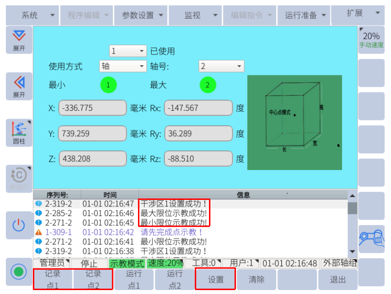 干涉区是与基座坐标系轴平行的立方体。系统信号对机器人进行判断是在干涉区内还是干涉区外,并把判断情况以信号方式输出M440-M455。干涉区的设定方法有以下三种: