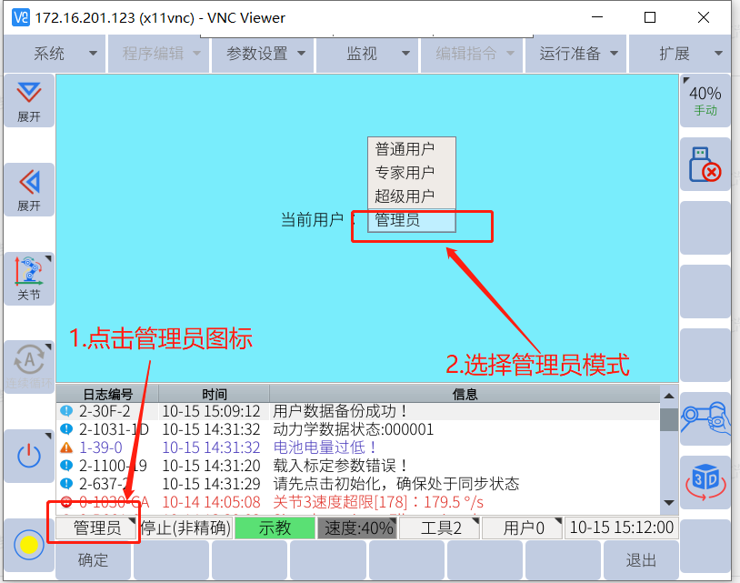 把U盘插入协作机器人机柜的 USB 口,USB 设备图标将显示在编程器屏幕的坐标区。登录管理员模式(密码333333),点击系统---机器人升级----一键升级,弹出如下界面,点击确定--直到升级完成。