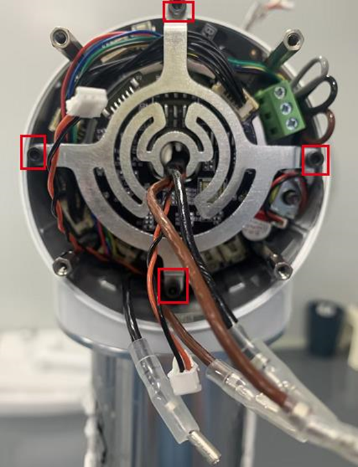 2.  拆下四颗螺丝后,将四角支架旋转一点,可以看到刹车抱闸还有一颗外六角螺丝,并将此螺丝松开。注意:小心别把线束扯断,如线束较紧,可以先把线束拆下,如上图。