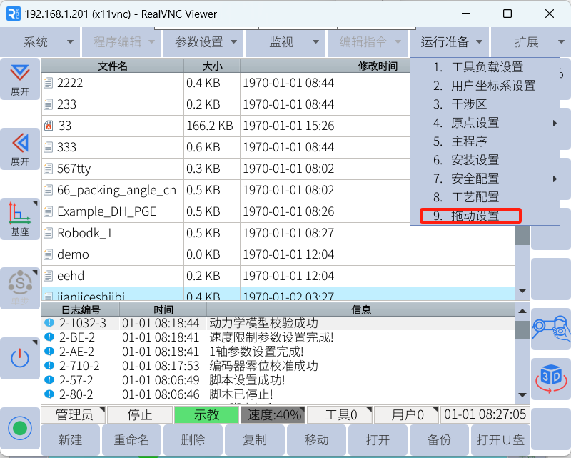 先升级为管理员权限模式,管理员权限密码为333333,在运行准备中,点击拖动设置。