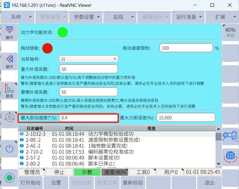 打开拖动后与打开拖动前的力矩差值占打开前力矩的百分比当该百分比大于所设置的百分比时,拖动使能不会被打开且系统提示“力矩校验失败,无法打开拖动”。造成的原因: 安装方式、负载、零位、连杆长度、额定转矩、减速比、机器人类型错误,这需要工程师自行判断。