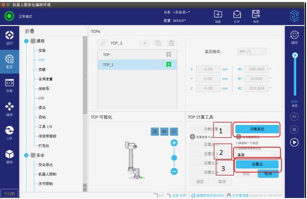 第三步:点击“设置点”,保证工具的方向和对应的 TCP 与所选的坐标系重合,如图-8标记3所示。