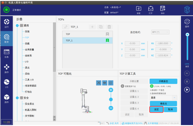 第三步:4个点设置好后,如图-6所示,点击设定,新建的TCP就设置好了。如图-7两个红框标记所示,新建的TCP_1与基座标系方向不同。