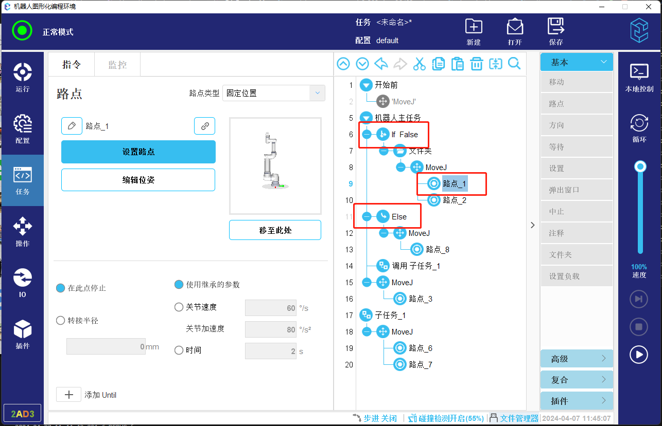 - CS 任务启动时,如果包含移动命令,会先弹出手动移动到安全位置的页面,由用户手动操作移动到安全位置,然后开始任务运行,保证程序启动时的安全性。目前查找程序启动位置的逻辑还不够完善,比如不进行调用的子程序的启动位置的查找,比如针对插件节点查找逻辑存在一定问题。