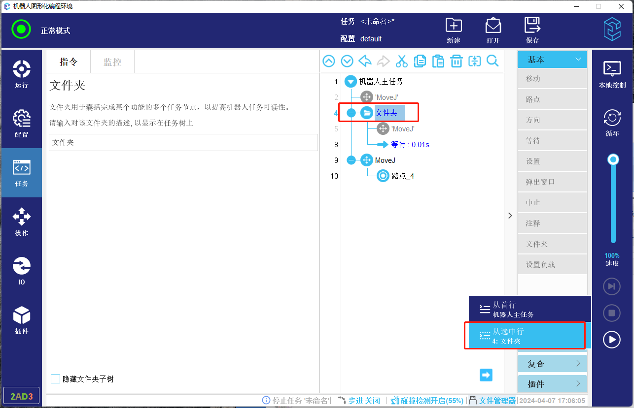 3. 如果起始行不可以作为起始安全位置节点,则会查找该节点上方的节点,如果存在可以作为起始位置的节点,则选做起始位置节点,如果不存在起始位置节点,则会进一步正向查找该节点内部是否存在起始位置节点,如果存在,则作为起始位置。如下方图-11所示任务,如果选择第4行文件夹为开始节点,则会找到路点_3作为起始位置。如果文件夹上方如果没有起始路点,则会向下找到起始点,如图-12所示则会找到路点_1作为起始位置。