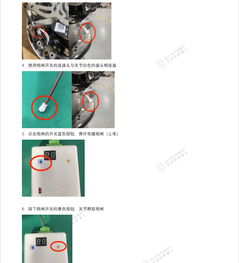 - 伺服关节损坏报警异常后无法通过以上松开抱闸方法操作,需手动松开,具体参考CS服务手册操作指南