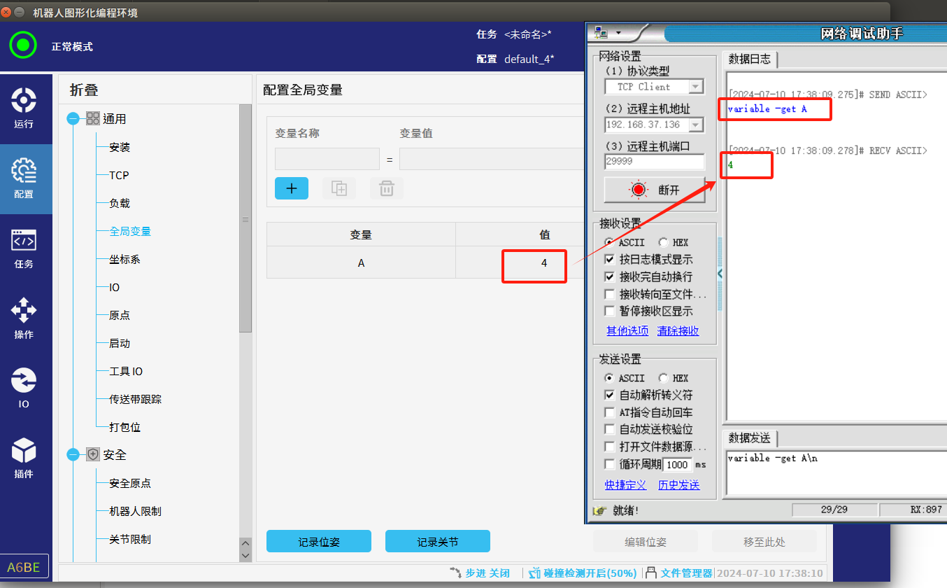 不论机器人程序处于停止或运行(包括通过示教器启动程序或者运行,外部通过30001发来的脚本):上位机均可通过29999端口的以下指令获取该全局变量,如图2-1所示通过29999端口连接机器人向机器人发送variable -get A\n,需注意的是 dashboard shell 命令默认需以“\n”作为结束输入标识符,因此在发送命令时要以“\n”结 尾,否则将被认为未完成输入,不会被响应。