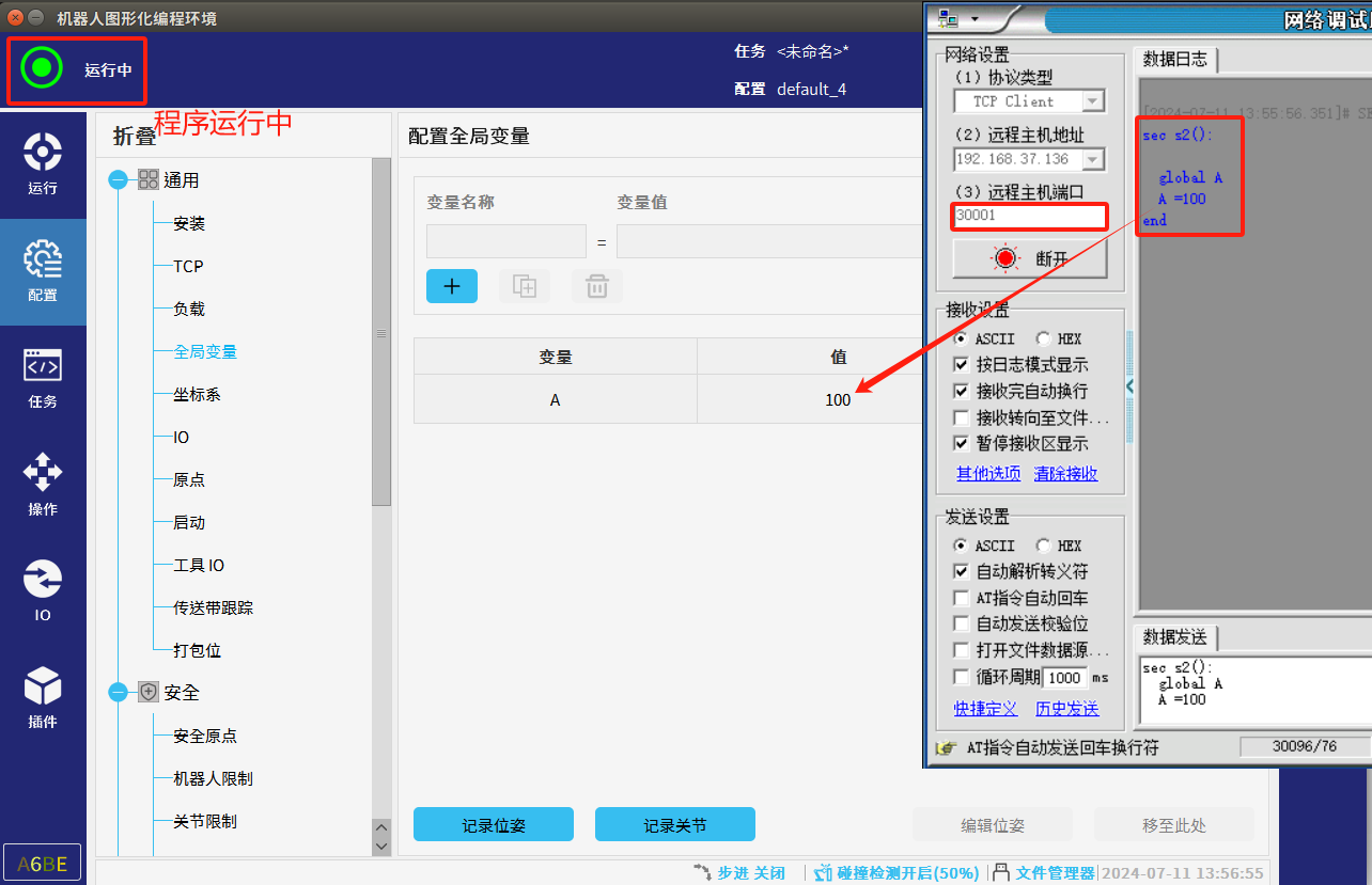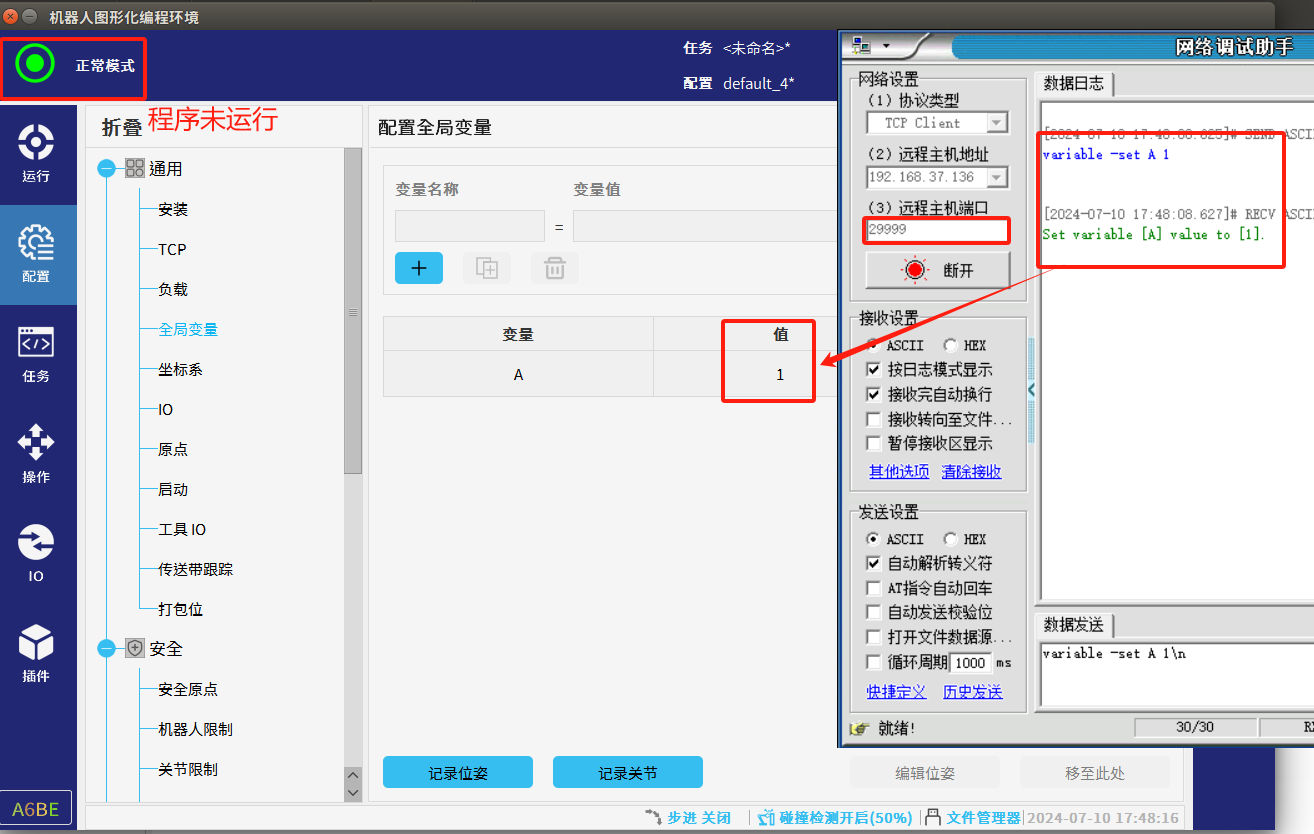 2. 使用30001端口修改全局变量时,需要定先义一个与机器人端名称一模一样的全局变量。