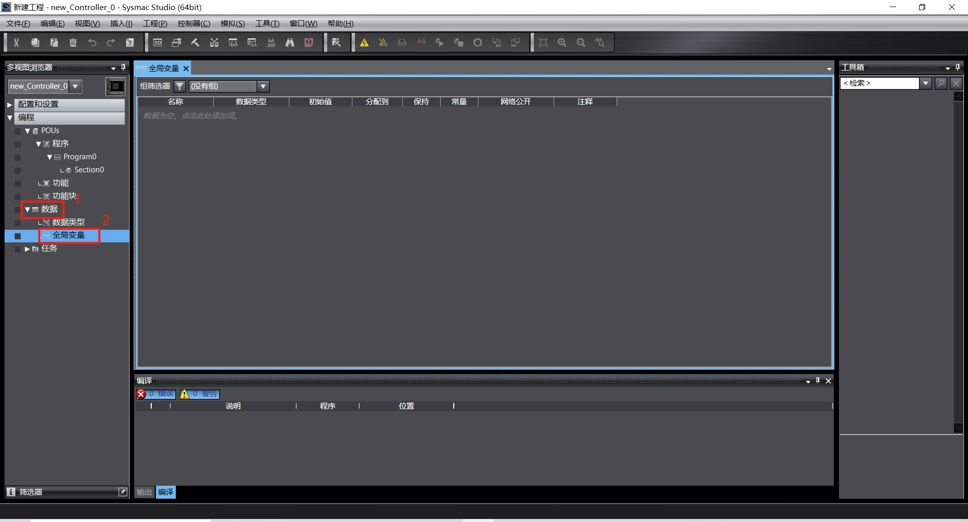 8、Sysmac与plc通讯设置完成后,点击左侧栏数据,找到下面全局变量,双击打开
