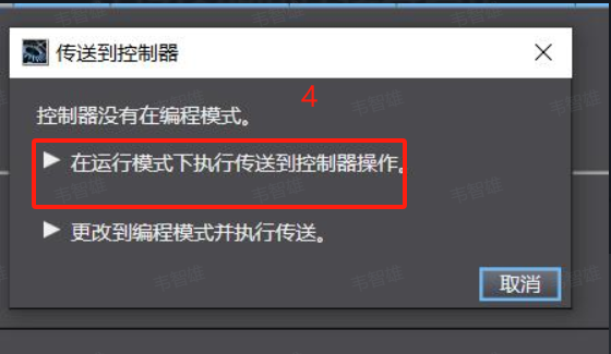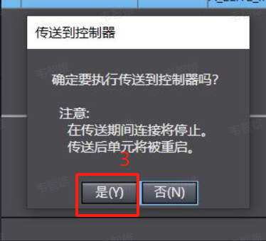 19、 设置完成后既可进行下载,点击图片中标识,将设备转至在线后点击传输到控制器,出现弹窗点击是,选择在运行模式下执行传送到控制器操作