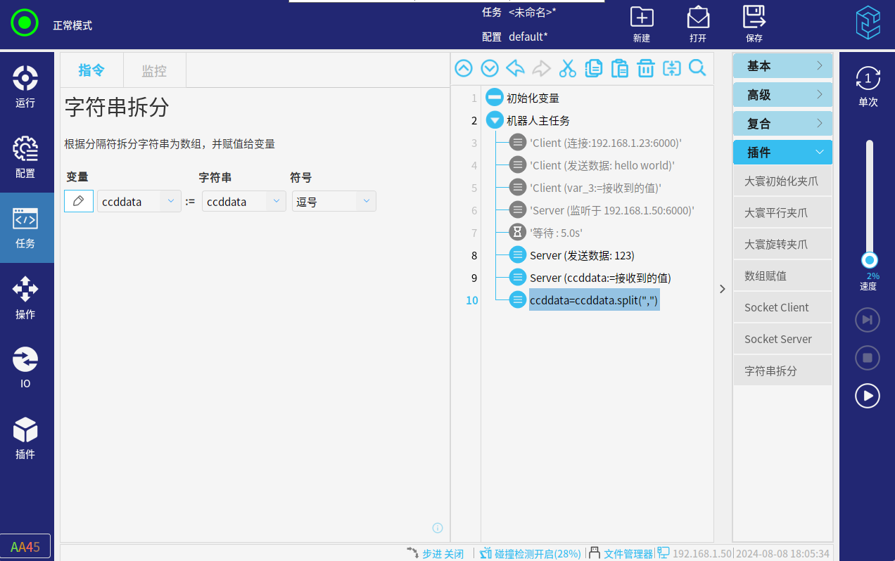 选择导航栏“任务”-指令栏选择“插件”-点击"Socket Client"-设置该指令(勾选“发送”-输入对应的数据类型)可以手动点击”发送“,也可以直接”运行任务“来发送