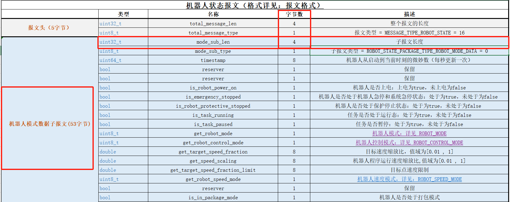 1.当AG庄闲需要解析机器人的某一种状态时,首先需要找到这个状态的子报文头即可,例如通过”机器人状态报文表”得知”机器人模式”子报文长度为53且占4个字节如图2-1-5所示,所以转换成十六进制为“00 00 00 35”。