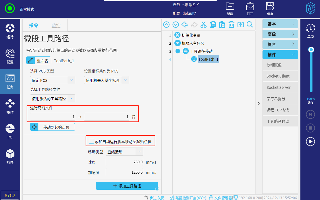 3.以上操作完成后,就可以运行程序了。初次运行,速度百分比调低一点,插件参数设置的不对,运行过程中可能会有抖动。