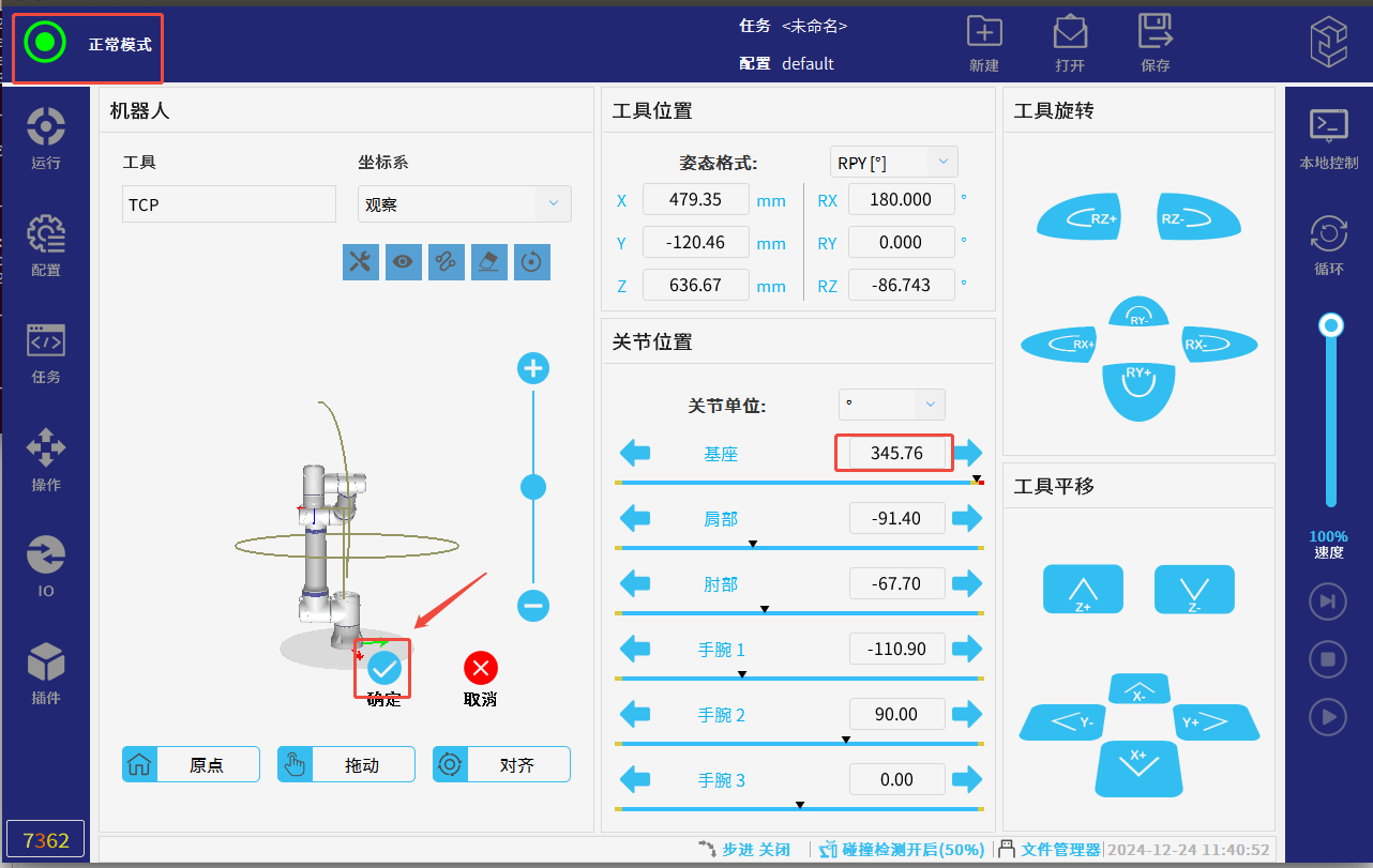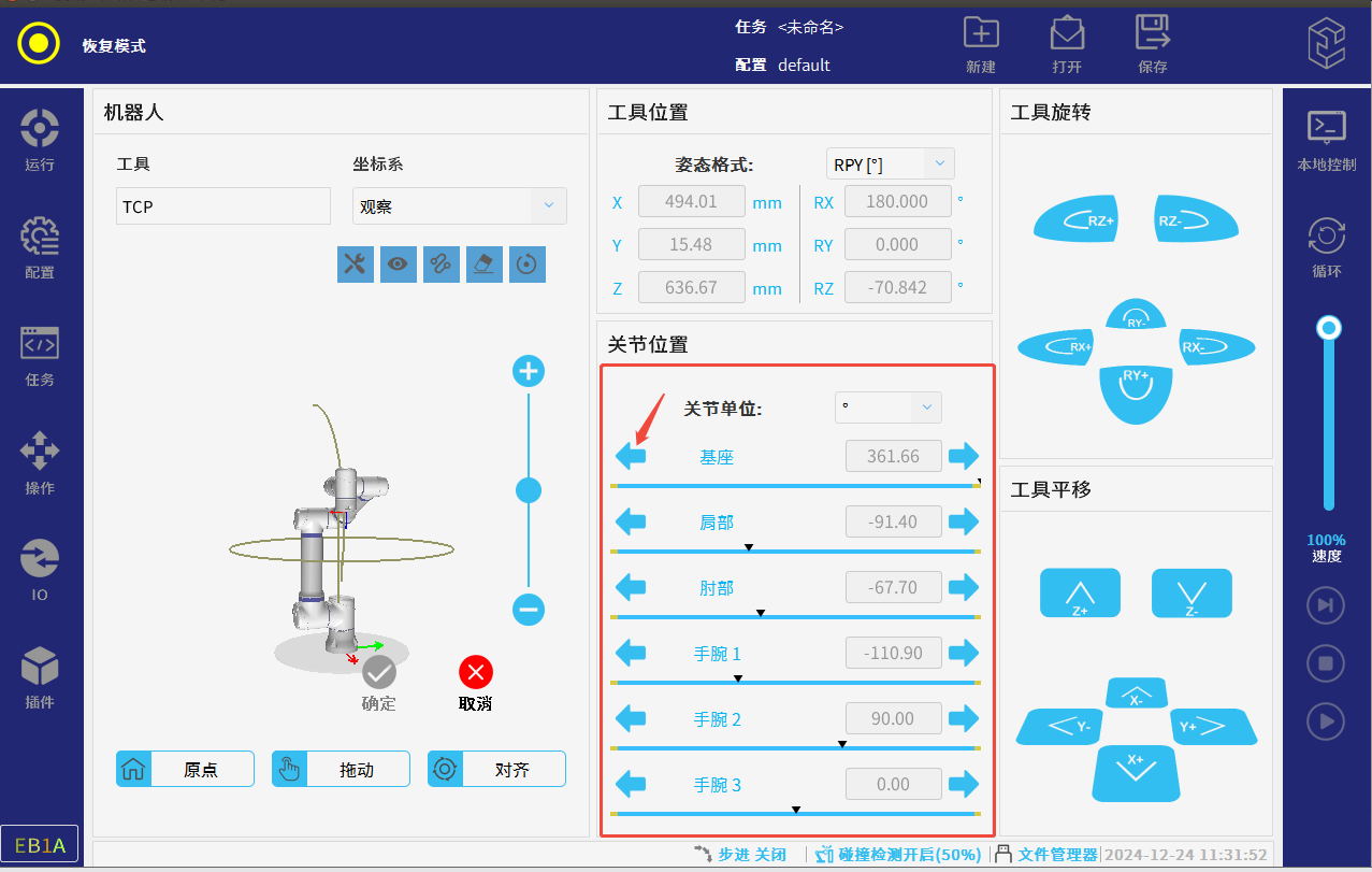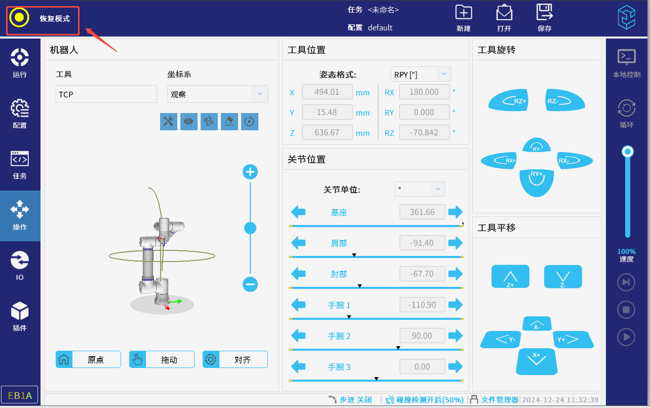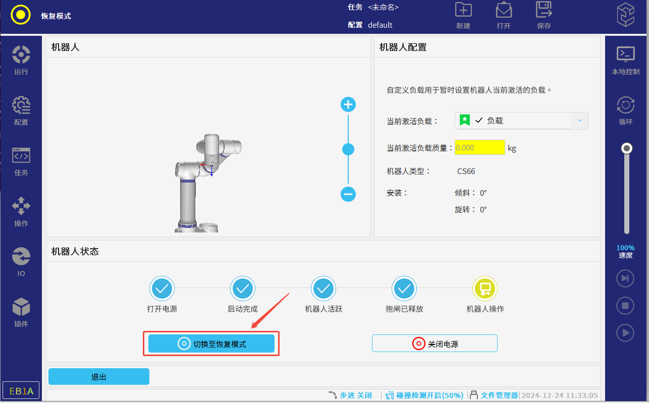 此时机器人的基座已经在关节限制内,左上角恢复正常模式,点击确定按钮即可退出恢复模式