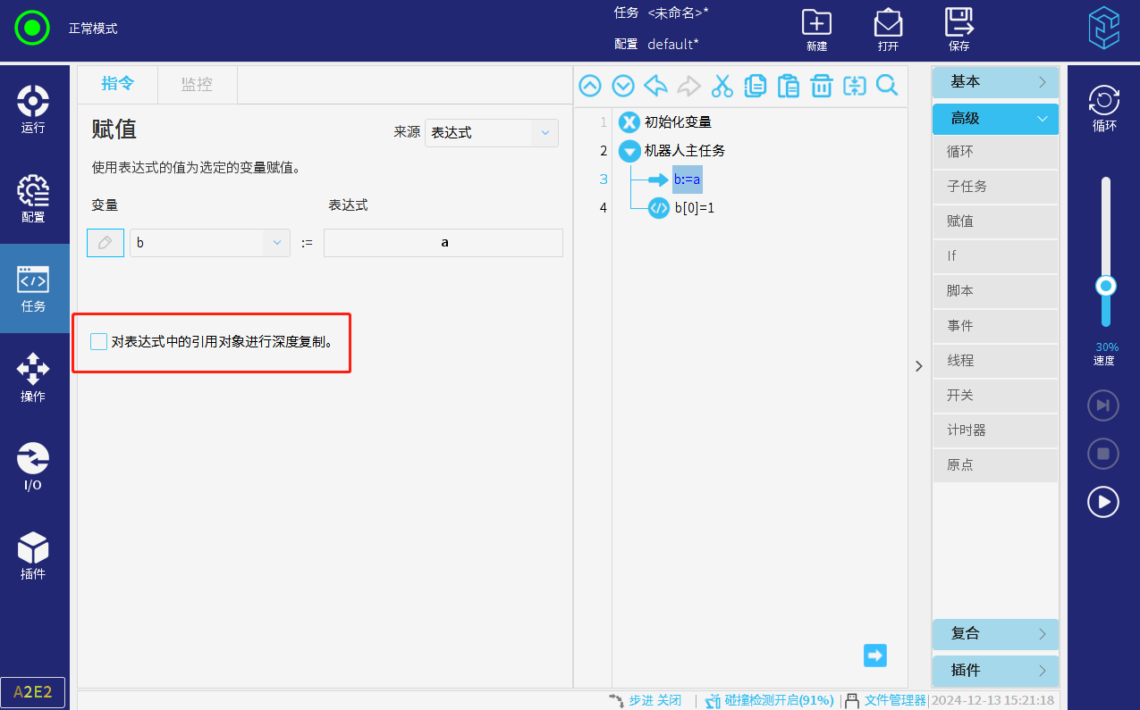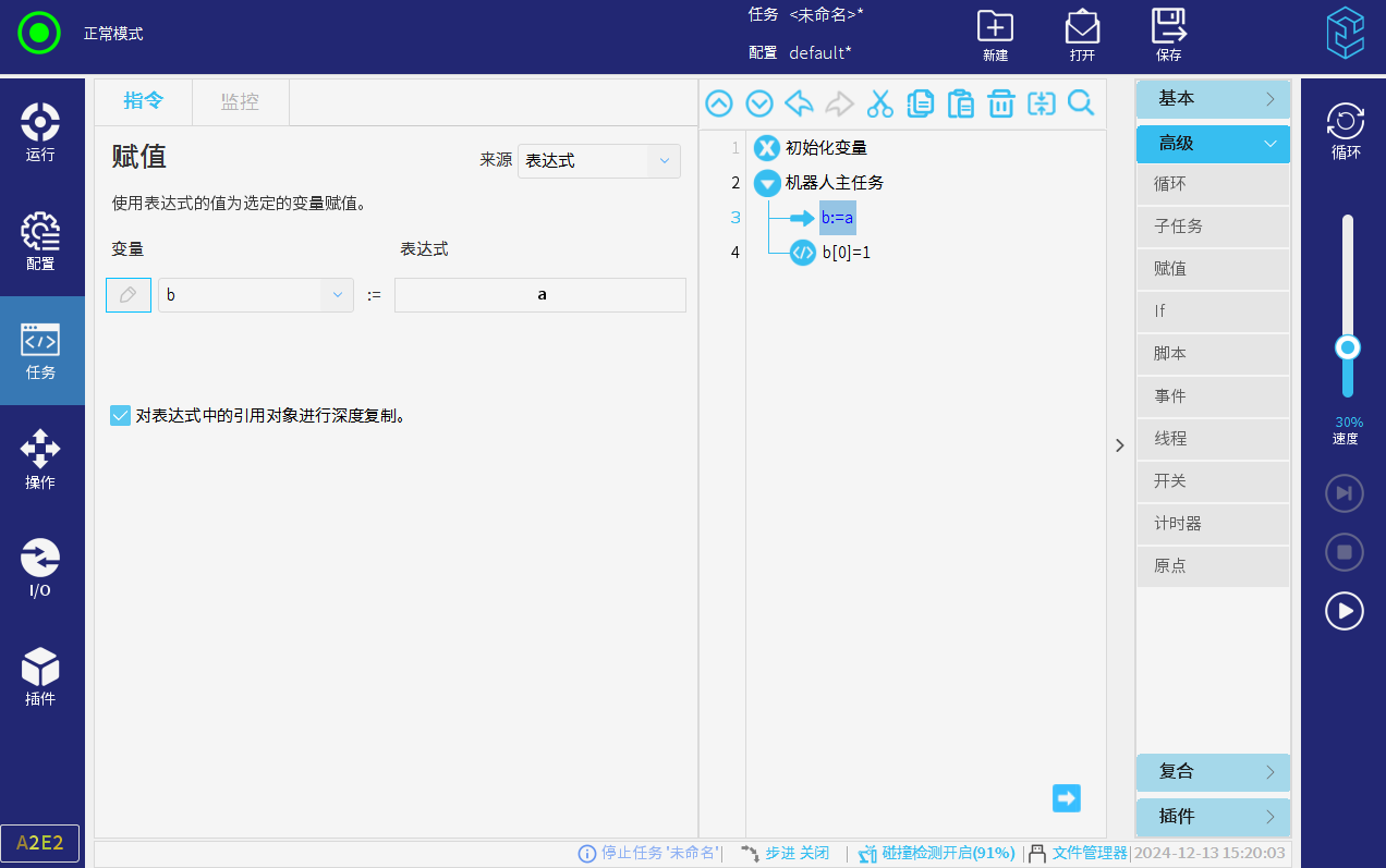 任务中添加下图程序程序,将数组a赋值给数组b,再修改b数组的值,勾选深度赋值