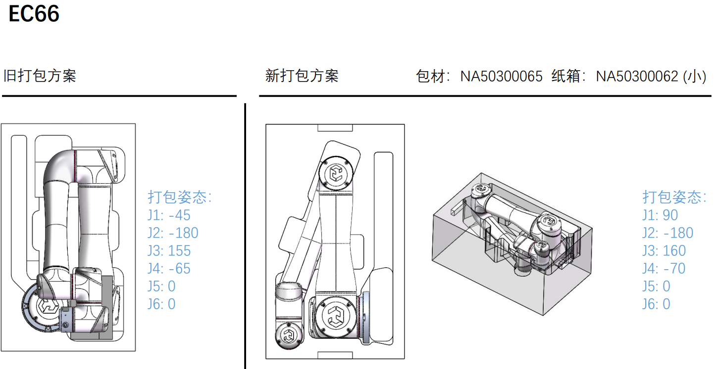 4. 运输过程中需要机器人的2、3轴不要受力,有支撑,合理的打包姿态运输能能够有效的避免机器人抖动。打包姿态如图: