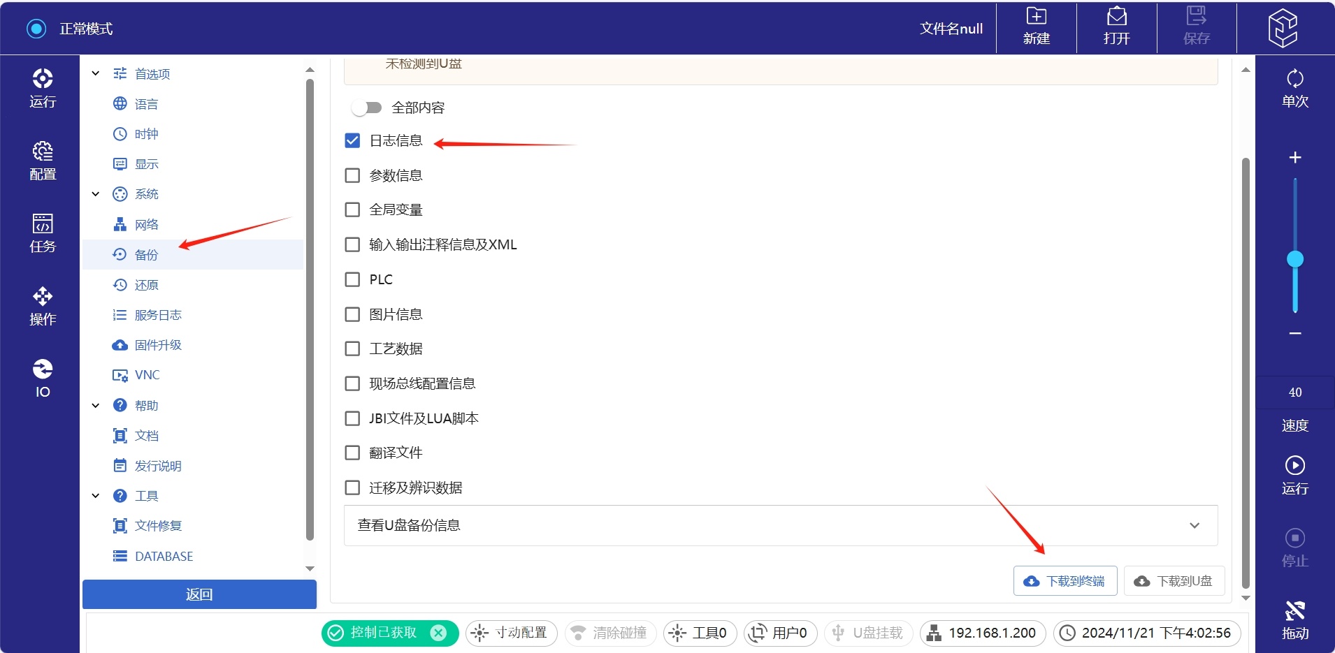 选择备份,勾选日志,下载到终端