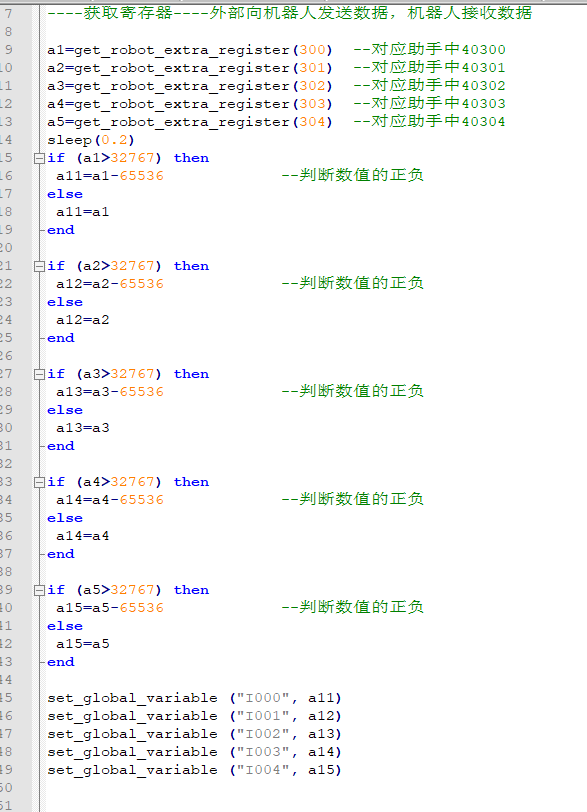 机器人读取寄存器300-304寄存器数值同时存入到I0-I4寄存器中,脚本如下