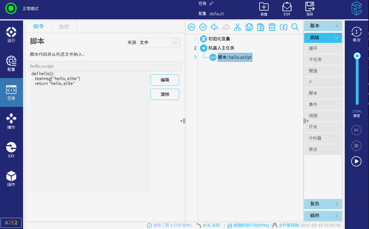 ScritptFunction是一款支持函数库自定义的插件,用于用户直接在插件中定义好脚本函数,可以直接通过示教器表达式键盘插入函数功能,实现函数调用,减少现场工程师编写任务树的工作量,如坐标变换、等待超时、 位姿偏移等,语法需支持Python格式。