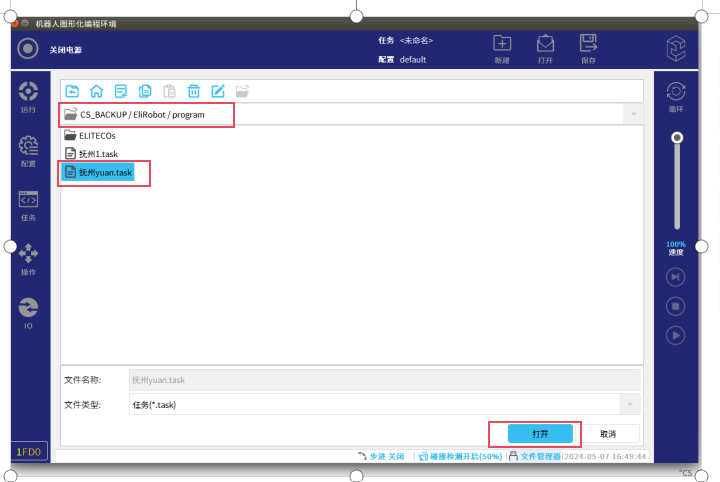 第三步:进入图-17界面后,点击CS_BACKUP→EliRobot→progarm(图中所示的是 打开任务文件,打开配置文件步骤一样)