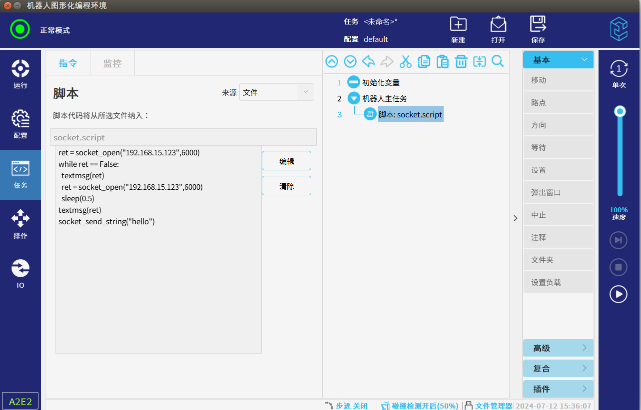1.本机做主站,机器人做从站。在 SocketTool 软件里,创建客户端,输入在 2.2 里获取的IP:192.168.15.128 ,端口号参考用户手册里的二次开发端口。