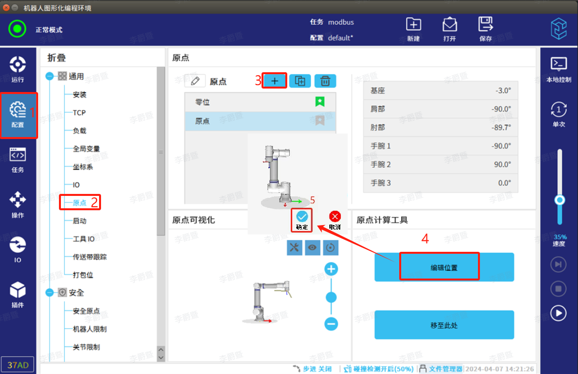 2 添加一个原点位置:配置—原点—编辑位置—移动到原点位点确认,如图2.1.2所示:(这里的原点是指机器人在项目中的一个安全位,可根据现场实际情况修改)