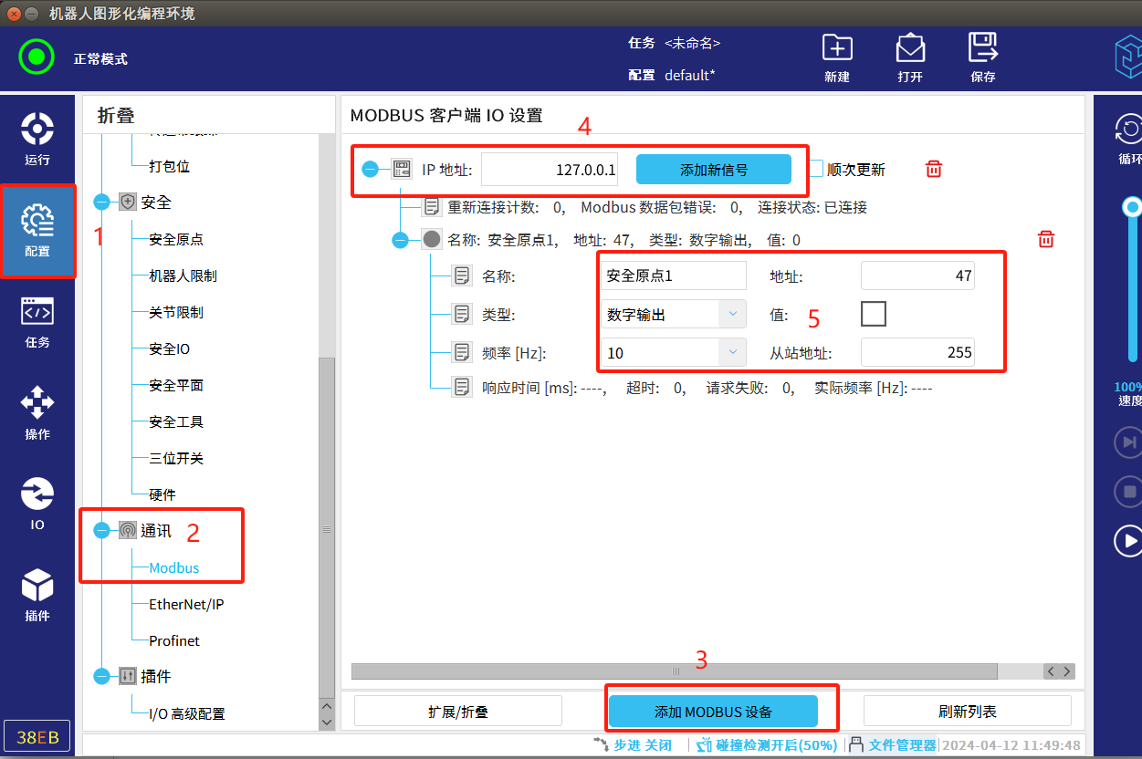 4. 通过IO/高级配置插件配置modbus信号为安全原点信号输出时需要先添加modbus信号才能在配置界面显示。