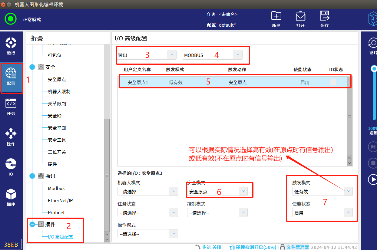 3. 配置modbus信号为安全原点信号输出,要求:应用版本要求2.11及以上,IO/高级配置插件版IOExtensionConfig-1.2.11.1及以上(modbus通讯机器人作为主站时建议使用)