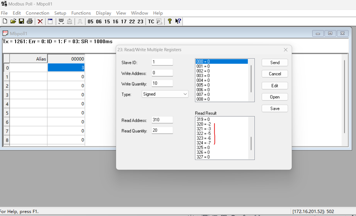 助手端将400寄存器设置为123,401寄存器设置为23,402寄存器设置为-345,403寄存器设置为-876,404寄存器设置为2345
