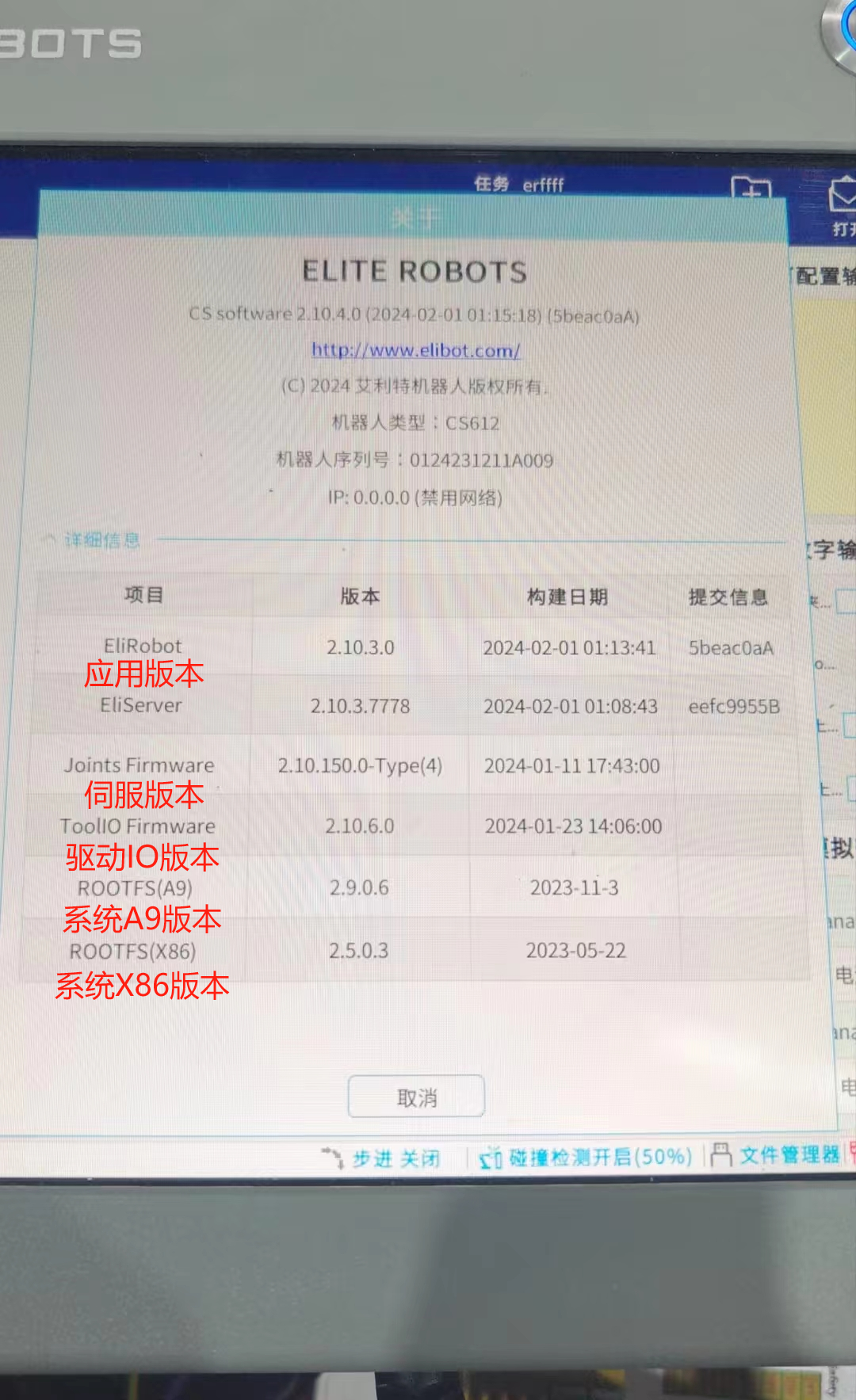 调试阶段建议全部勾选进行升级,也可单独勾选应用升级(应用:系统版本,一般是解决应用软件的bug和界面优化;MCU: 指伺服升级;驱动IO:指末端IO的升级)。点击“是”,会自动进行更新系统;请勿操作机器人或将其断电。等待更新后重启。